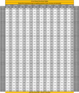 How to score: Maintain the required straightline posture; any loss of position ends the attempt. Read the Plank table in the PDF for exact thresholds.